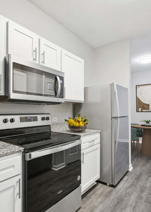The one-bedroom A1 floor plan encompasses 768 square feet, offering a practical layout. This apartment includes a full-size washer and dryer, stainless steel appliances, granite countertops, and white shaker cabinetry. The open-concept design integrates the living, dining, and kitchen areas, creating a cohesive living space.